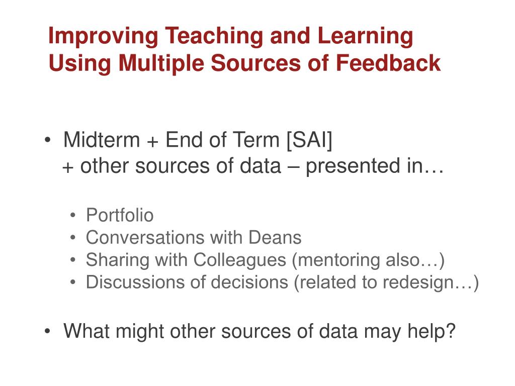Improving Teaching and LearningUsing Multiple Sources of Feedback • Midterm + End of Term [SAI] + other sources of data – presented in… • Portfolio • Conversations with Deans • Sharing with Colleagues (mentoring also…) • Discussions of decisions (related to redesign…) • What might other sources of data may help?