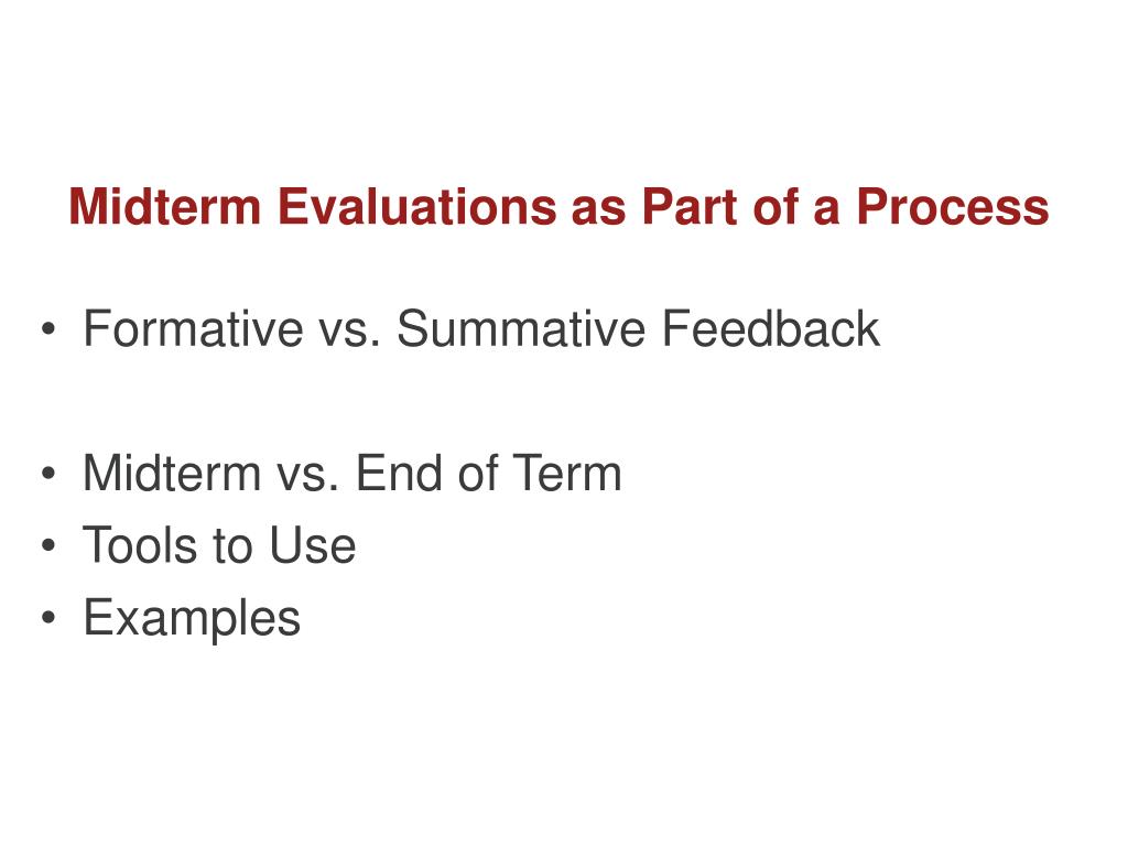 Midterm Evaluations as Part of a Process • Formative vs. Summative Feedback • Midterm vs. End of Term • Tools to Use • Examples