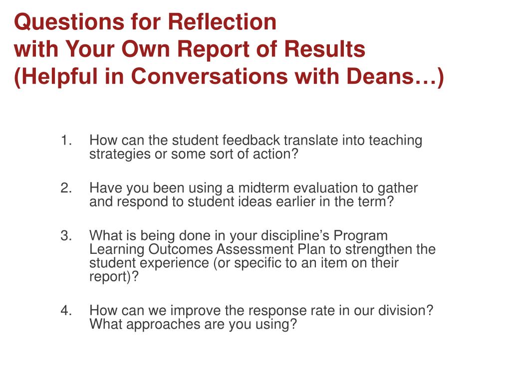 Questions for Reflection with Your Own Report of Results(Helpful in Conversations with Deans…) • How can the student feedback translate into teaching strategies or some sort of action? • Have you been using a midterm evaluation to gather and respond to student ideas earlier in the term? • What is being done in your discipline’s Program Learning Outcomes Assessment Plan to strengthen the student experience (or specific to an item on their report)? • How can we improve the response rate in our division? What approaches are you using?