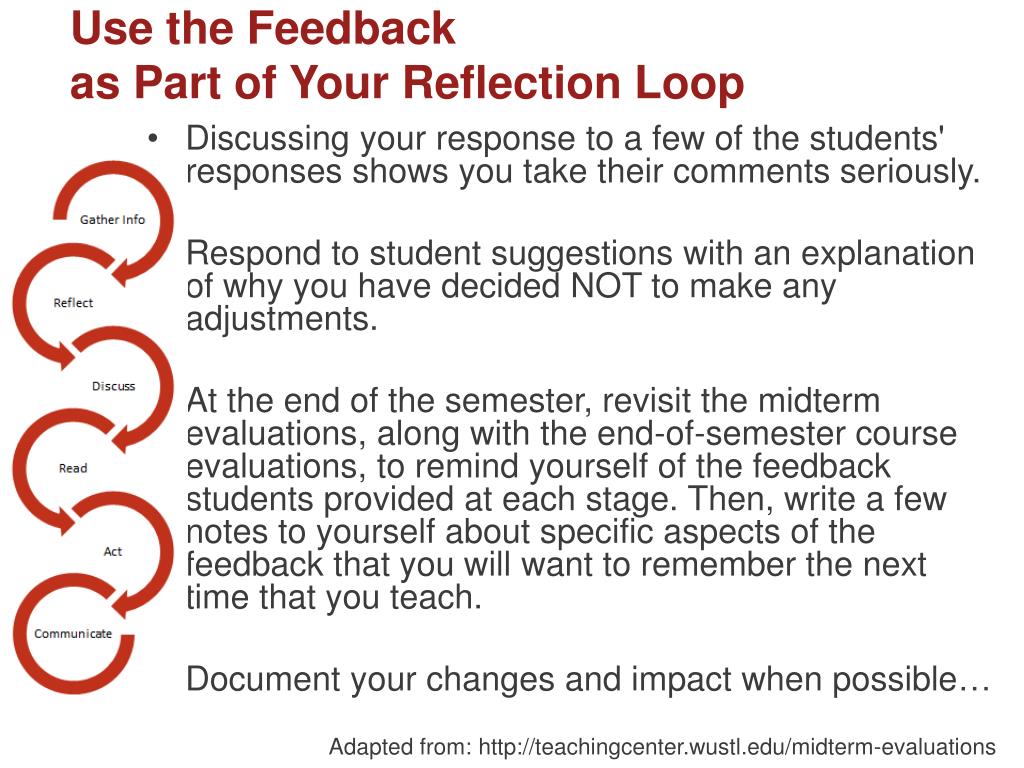Use the Feedback as Part of Your Reflection Loop • Discussing your response to a few of the students' responses shows you take their comments seriously. • Respond to student suggestions with an explanation of why you have decided NOT to make any adjustments. • At the end of the semester, revisit the midterm evaluations, along with the end-of-semester course evaluations, to remind yourself of the feedback students provided at each stage. Then, write a few notes to yourself about specific aspects of the feedback that you will want to remember the next time that you teach. • Document your changes and impact when possible… Adapted from: http://teachingcenter.wustl.edu/midterm-evaluations