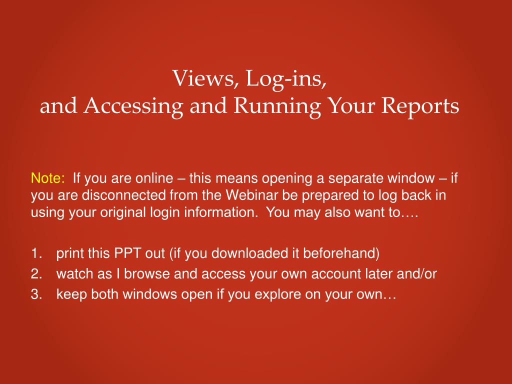 Views, Log-ins,and Accessing and Running Your Reports Note: If you are online – this means opening a separate window – if you are disconnected from the Webinar be prepared to log back in using your original login information. You may also want to…. print this PPT out (if you downloaded it beforehand) watch as I browse and access your own account later and/or keep both windows open if you explore on your own…