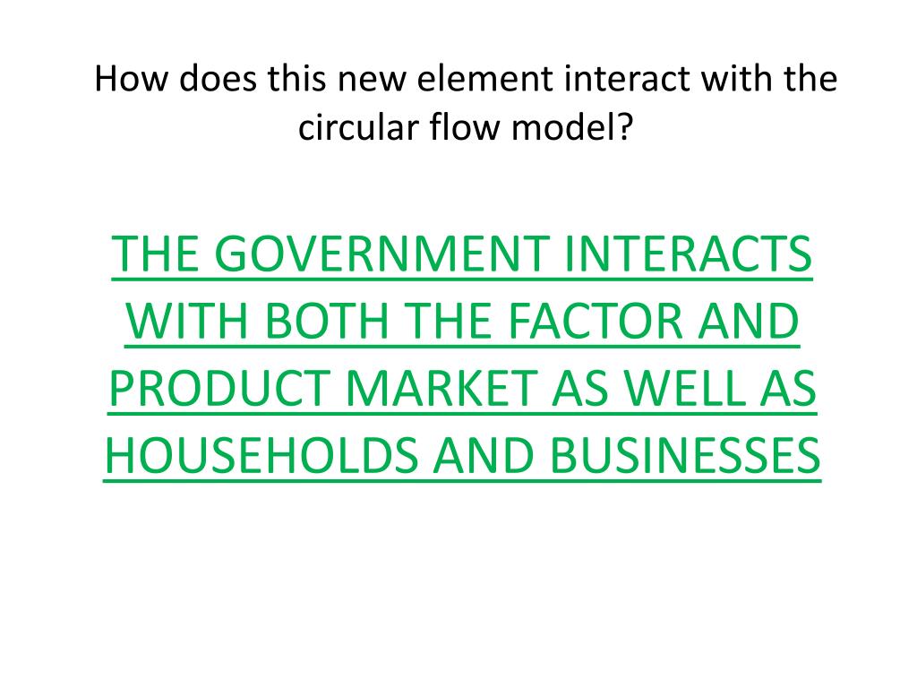 How does this new element interact with the circular flow model? THE GOVERNMENT INTERACTS WITH BOTH THE FACTOR AND PRODUCT MARKET AS WELL AS HOUSEHOLDS AND BUSINESSES
