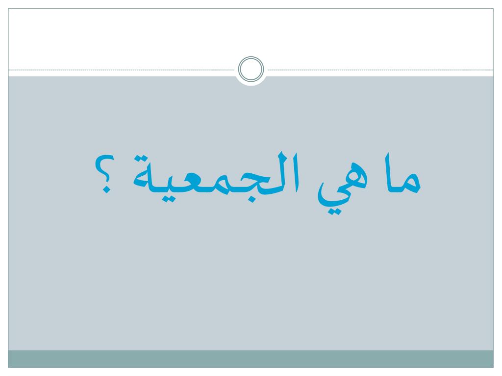 تعزيز و تقوية قدرات المنظمات و الجمعيات الاجتماعية. التدبير و التسيير الجمعوي. تقديم الورشة والمشاركين. ما هي الجمعية ؟. التعريف القانوني. " الجمعية هي اتفاق لتحقيق تعاون مشترك بين شخصين أو عدة أشخاص لإستخدام معلوماتهم أو نشاطهم لغاية غير توزيع الأرباح فيما بينهم "