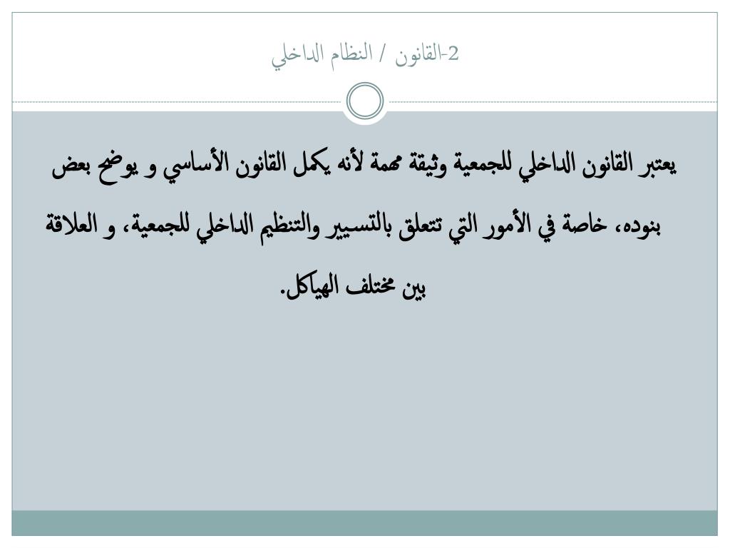 2-القانون / النظام الداخلي يعتبر القانون الداخلي للجمعية وثيقة مهمة لأنه يكمل القانون الأساسي و يوضح بعض بنوده، خاصة في الأمور التي تتعلق بالتسيير والتنظيم الداخلي للجمعية، و العلاقة بين مختلف الهياكل.