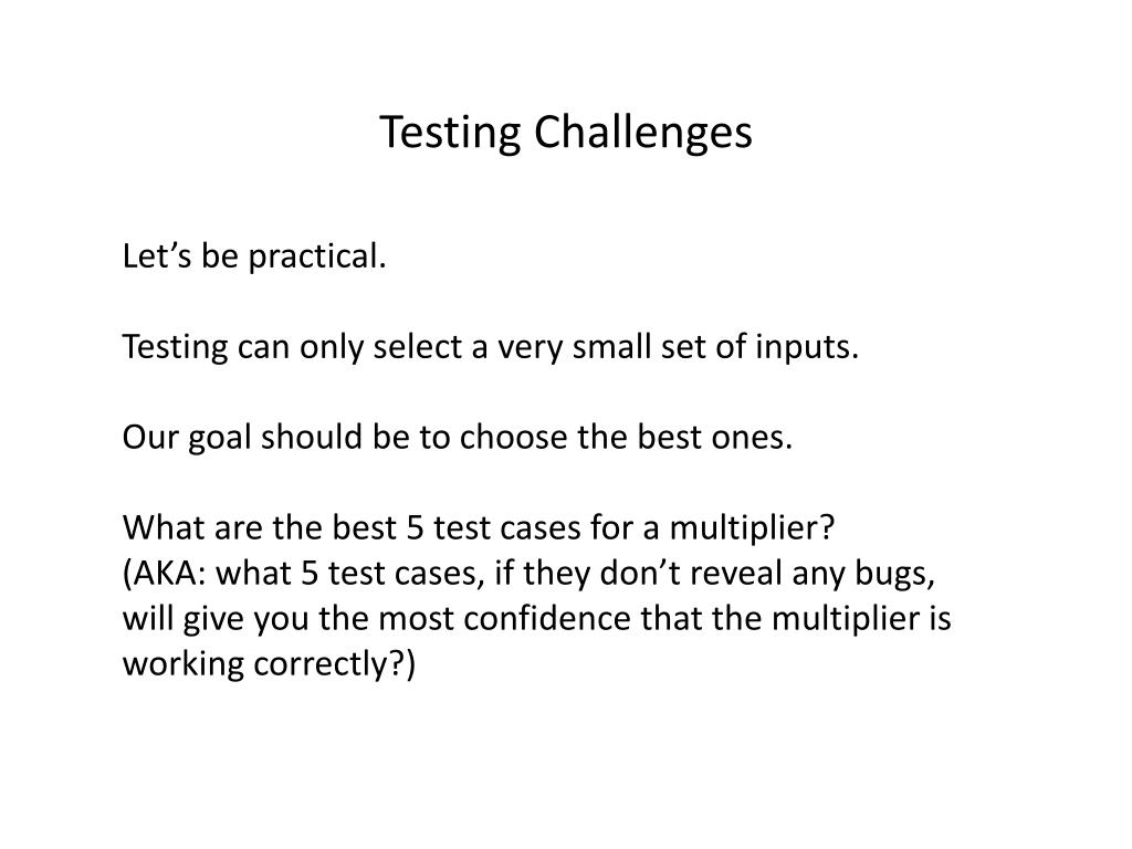 Testing Challenges Let’s be practical. Testing can only select a very small set of inputs. Our goal should be to choose the best ones. What are the best 5 test cases for a multiplier? (AKA: what 5 test cases, if they don’t reveal any bugs, will give you the most confidence that the multiplier is working correctly?)