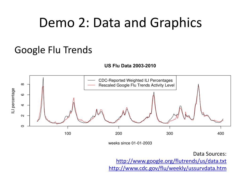 Demo 2: Data and Graphics Google Flu Trends Data Sources: http://www.google.org/flutrends/us/data.txt http://www.cdc.gov/flu/weekly/ussurvdata.htm