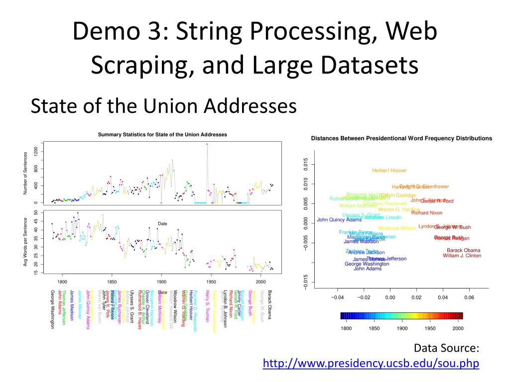 Demo 3: String Processing, Web Scraping, and Large Datasets State of the Union Addresses Data Source: http://www.presidency.ucsb.edu/sou.php