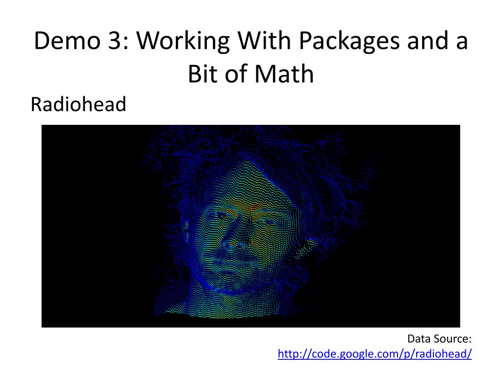 Demo 3: Working With Packages and a Bit of Math Radiohead Data Source: http://code.google.com/p/radiohead/