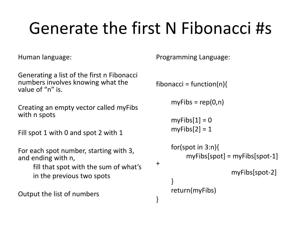 Generate the first N Fibonacci #s Human language: Generating a list of the first n Fibonacci numbers involves knowing what the value of “n” is. Creating an empty vector called myFibs with n spots Fill spot 1 with 0 and spot 2 with 1 For each spot number, starting with 3, and ending with n, fill that spot with the sum of what’s in the previous two spots Output the list of numbers Programming Language: fibonacci = function(n){ myFibs = rep(0,n) myFibs[1] = 0 myFibs[2] = 1 for(spot in 3:n){ myFibs[spot] = myFibs[spot-1] + myFibs[spot-2] } return(myFibs) }