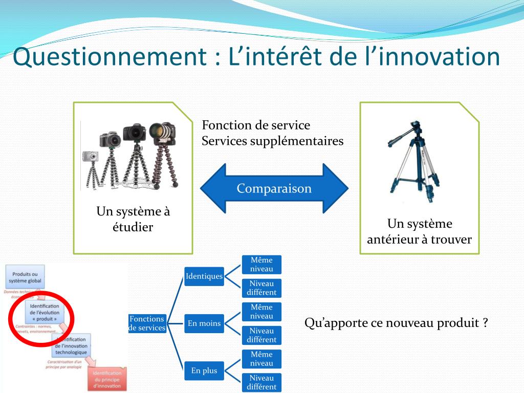 Questionnement : L’intérêt de l’innovation Fonction de service Services supplémentaires Comparaison Un système à étudier Un système antérieur à trouver Qu’apporte ce nouveau produit ?