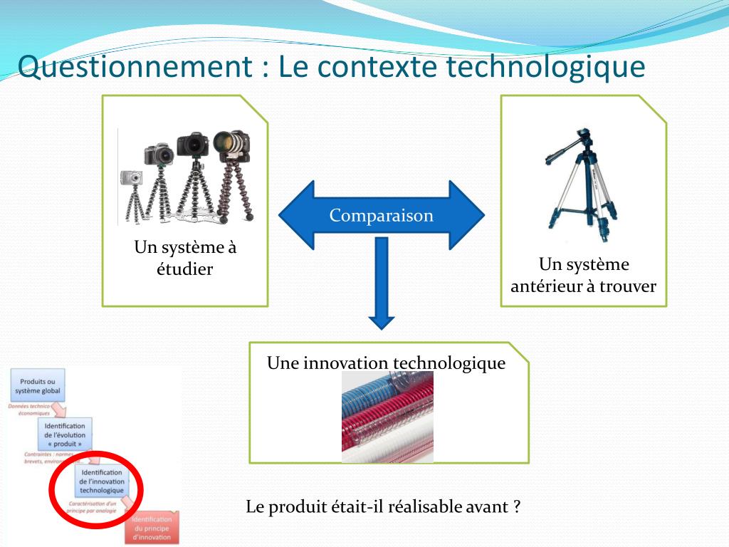 Questionnement : Le contexte technologique Comparaison Un système à étudier Un système antérieur à trouver Une innovation technologique Le produit était-il réalisable avant ?