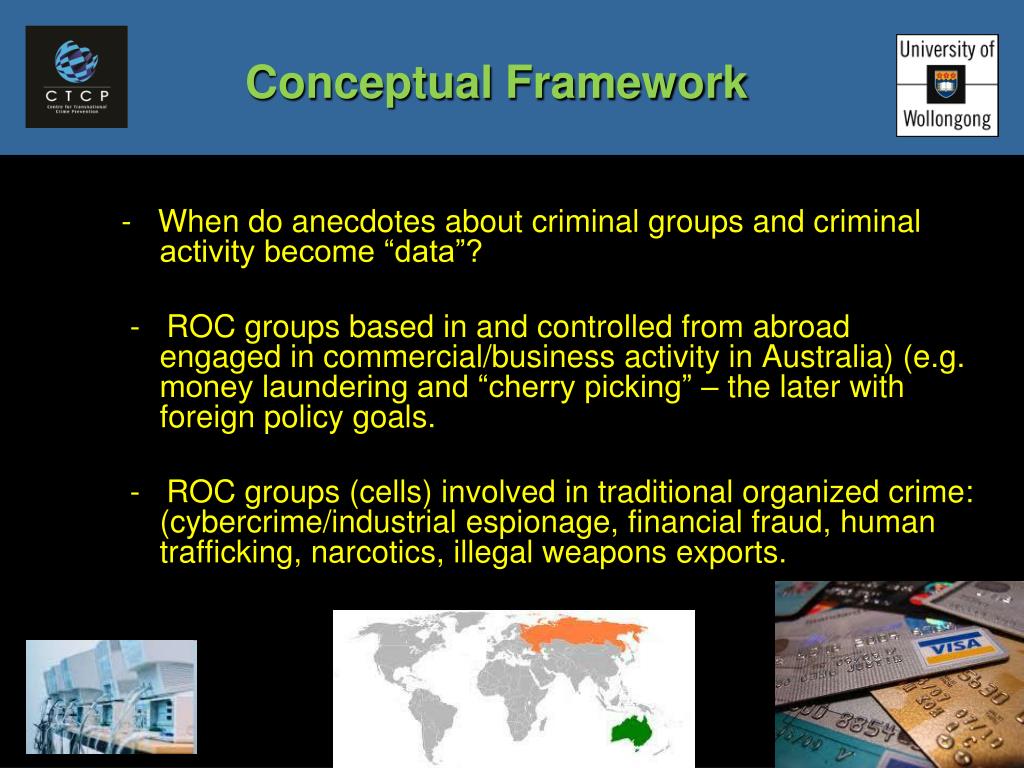 Conceptual Framework - When do anecdotes about criminal groups and criminal activity become “data”? - ROC groups based in and controlled from abroad engaged in commercial/business activity in Australia) (e.g. money laundering and “cherry picking” – the later with foreign policy goals. - ROC groups (cells) involved in traditional organized crime: (cybercrime/industrial espionage, financial fraud, human trafficking, narcotics, illegal weapons exports.