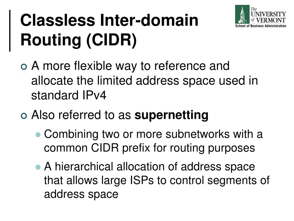 Classless Inter-domain Routing (CIDR) • A more flexible way to reference and allocate the limited address space used in standard IPv4 • Also referred to as supernetting • Combining two or more subnetworks with a common CIDR prefix for routing purposes • A hierarchical allocation of address space that allows large ISPs to control segments of address space