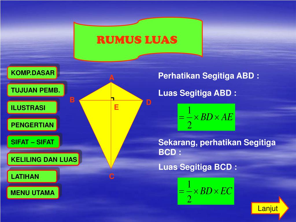 A B D E C RUMUS LUAS KOMP.DASAR Perhatikan Segitiga ABD : TUJUAN PEMB. Luas Segitiga ABD : ILUSTRASI PENGERTIAN SIFAT – SIFAT Sekarang, perhatikan Segitiga BCD : KELILING DAN LUAS Luas Segitiga BCD : LATIHAN MENU UTAMA Lanjut