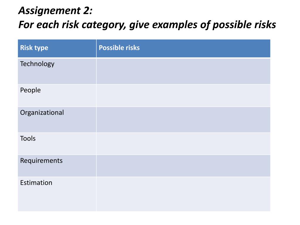 Assignement 2:For each risk category, give examples of possible risks