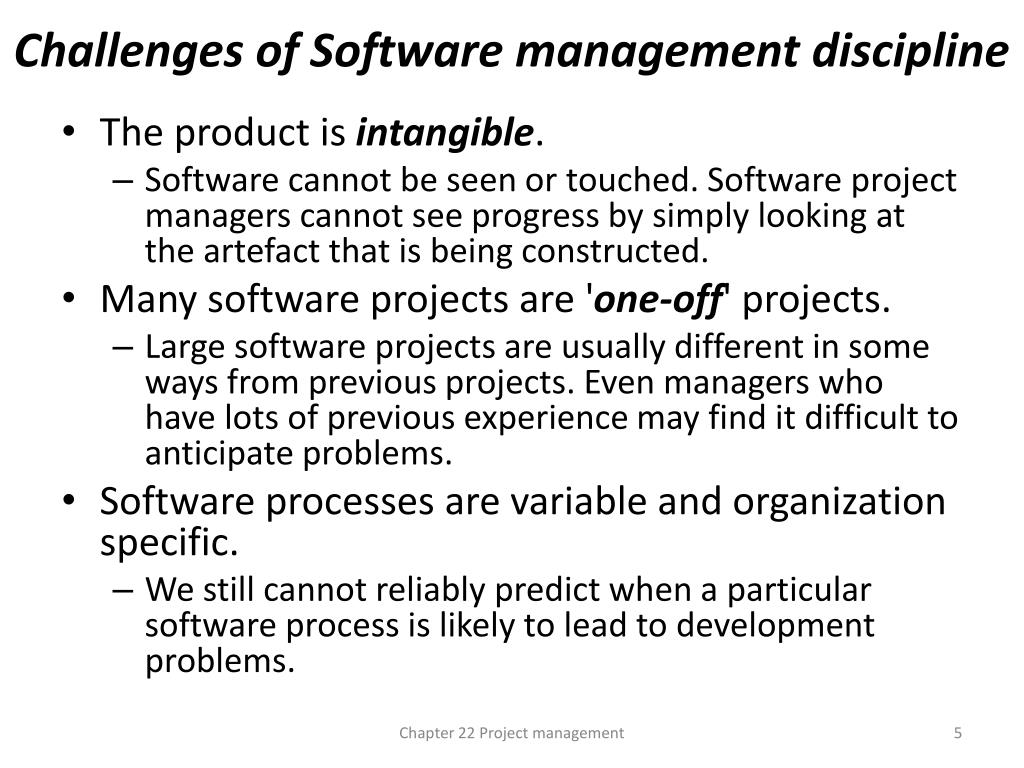 Challenges of Software management discipline • The product is intangible. • Software cannot be seen or touched. Software project managers cannot see progress by simply looking at the artefact that is being constructed. • Many software projects are 'one-off' projects. • Large software projects are usually different in some ways from previous projects. Even managers who have lots of previous experience may find it difficult to anticipate problems. • Software processes are variable and organization specific. • We still cannot reliably predict when a particular software process is likely to lead to development problems. Chapter 22 Project management