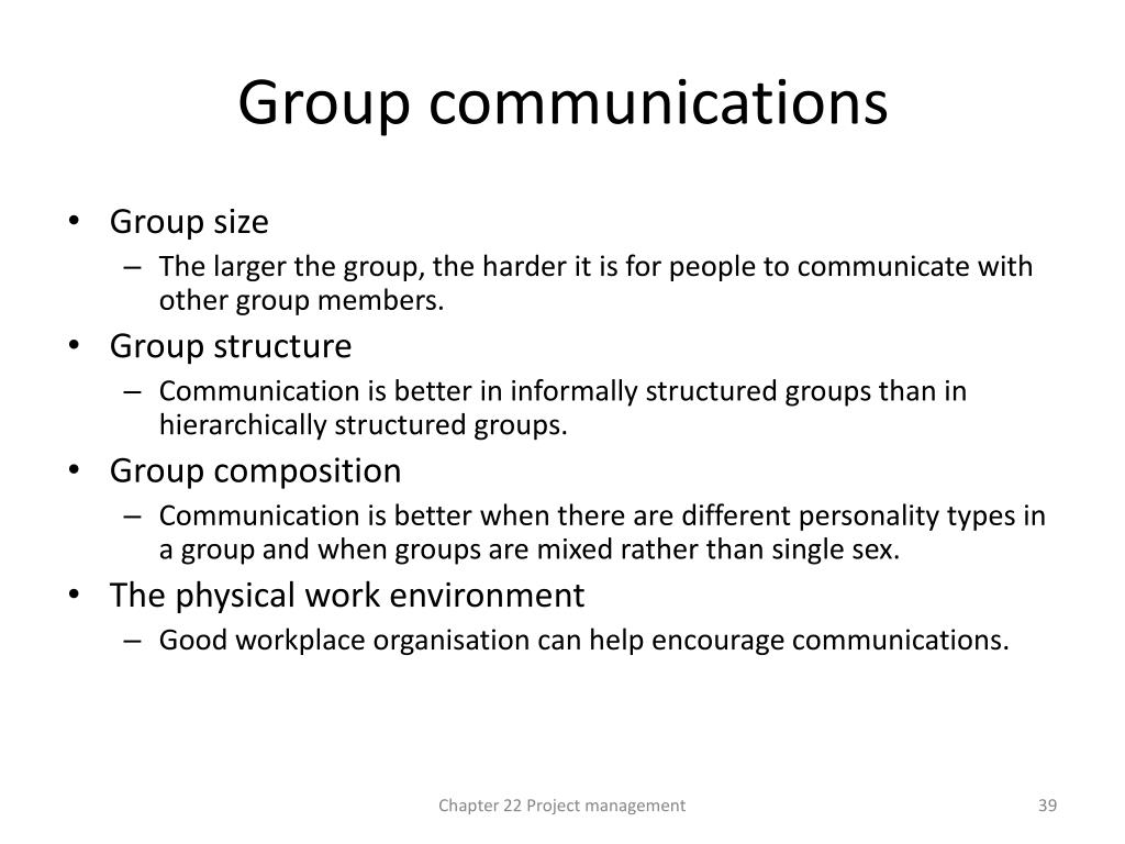 Group communications • Group size • The larger the group, the harder it is for people to communicate with other group members. • Group structure • Communication is better in informally structured groups than in hierarchically structured groups. • Group composition • Communication is better when there are different personality types in a group and when groups are mixed rather than single sex. • The physical work environment • Good workplace organisation can help encourage communications. Chapter 22 Project management