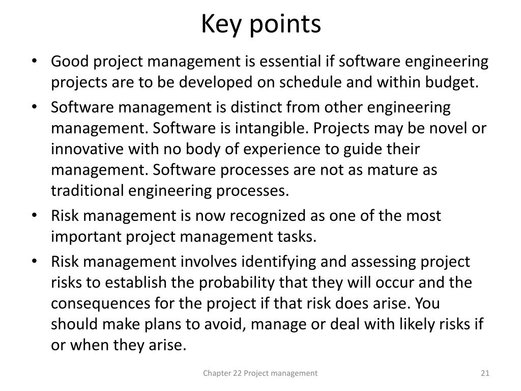 Key points • Good project management is essential if software engineering projects are to be developed on schedule and within budget. • Software management is distinct from other engineering management. Software is intangible. Projects may be novel or innovative with no body of experience to guide their management. Software processes are not as mature as traditional engineering processes. • Risk management is now recognized as one of the most important project management tasks. • Risk management involves identifying and assessing project risks to establish the probability that they will occur and the consequences for the project if that risk does arise. You should make plans to avoid, manage or deal with likely risks if or when they arise. Chapter 22 Project management