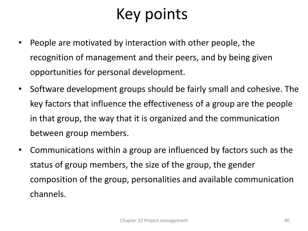 Key points • People are motivated by interaction with other people, the recognition of management and their peers, and by being given opportunities for personal development. • Software development groups should be fairly small and cohesive. The key factors that influence the effectiveness of a group are the people in that group, the way that it is organized and the communication between group members. • Communications within a group are influenced by factors such as the status of group members, the size of the group, the gender composition of the group, personalities and available communication channels. Chapter 22 Project management