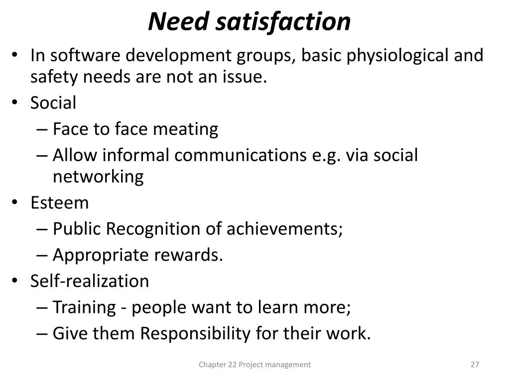 Need satisfaction • In software development groups, basic physiological and safety needs are not an issue. • Social • Face to face meating • Allow informal communications e.g. via social networking • Esteem • Public Recognition of achievements; • Appropriate rewards. • Self-realization • Training - people want to learn more; • Give them Responsibility for their work. Chapter 22 Project management