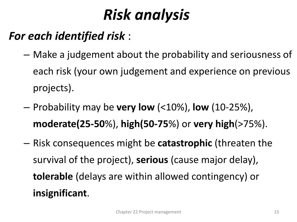 Risk analysis For each identified risk : • Make a judgement about the probability and seriousness of each risk (your own judgement and experience on previous projects). • Probability may be very low (<10%), low (10-25%), moderate(25-50%), high(50-75%) or veryhigh(>75%). • Risk consequences might be catastrophic (threaten the survival of the project), serious (cause major delay), tolerable (delays are within allowed contingency) or insignificant. Chapter 22 Project management
