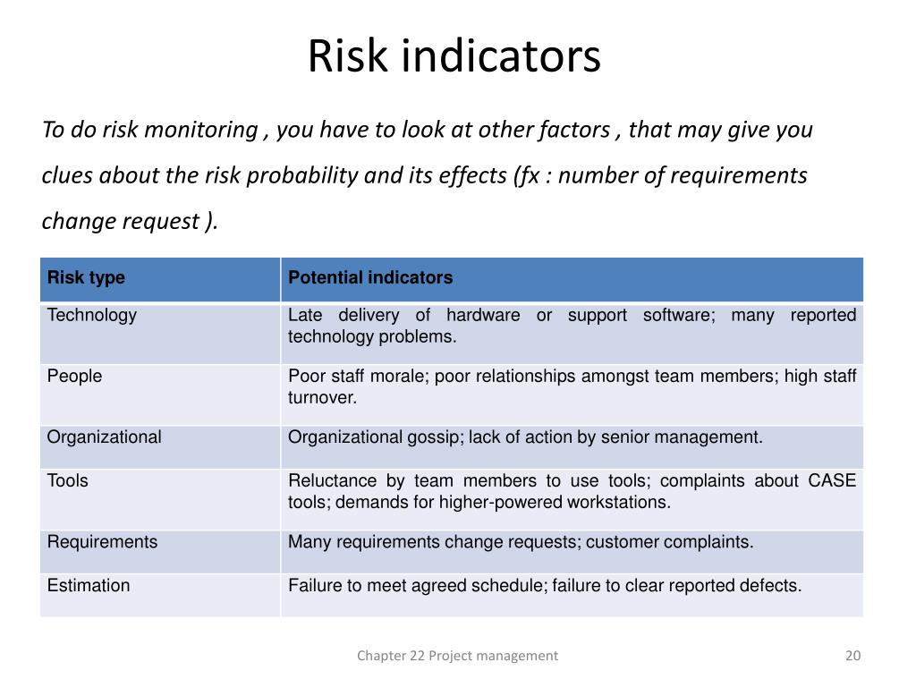 Risk indicators To do risk monitoring , you have to look at other factors , that may give you clues about the risk probability and its effects (fx : number of requirements change request ). Chapter 22 Project management