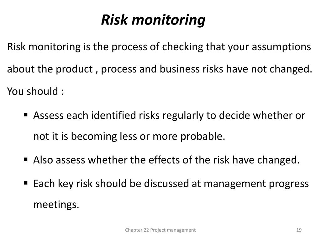Risk monitoring Risk monitoring is the process of checking that your assumptions about the product , process and business risks have not changed. You should : • Assess each identified risks regularly to decide whether or not it is becoming less or more probable. • Also assess whether the effects of the risk have changed. • Each key risk should be discussed at management progress meetings. Chapter 22 Project management