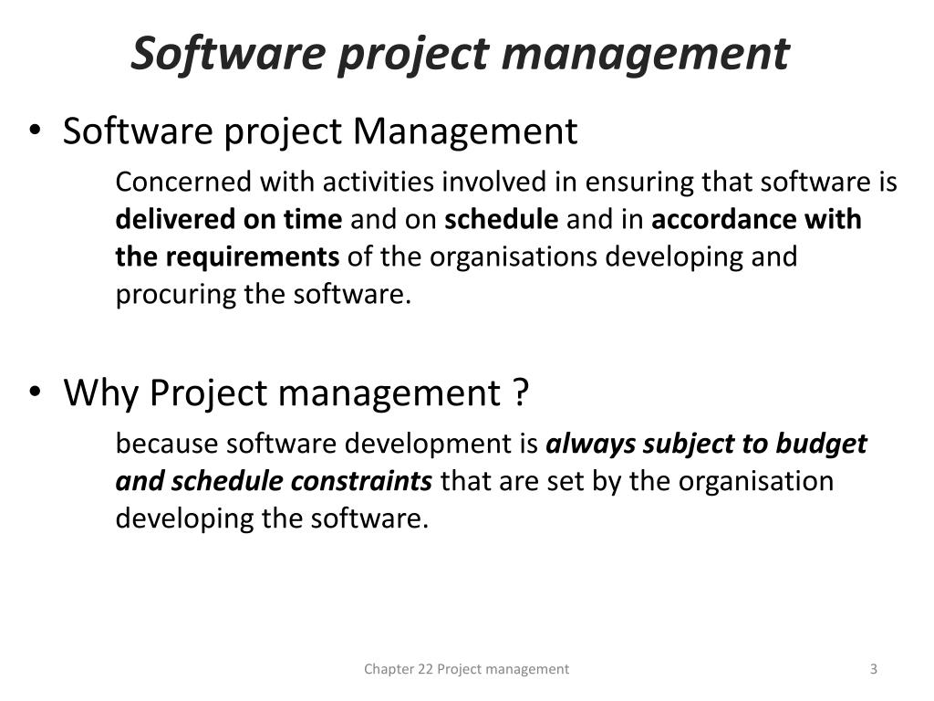 Software project management • Software project Management Concerned with activities involved in ensuring that software is delivered on time and on scheduleand in accordance with the requirementsof the organisations developing and procuring the software. • Why Project management ? because software development is always subject to budget and schedule constraints that are set by the organisation developing the software. Chapter 22 Project management