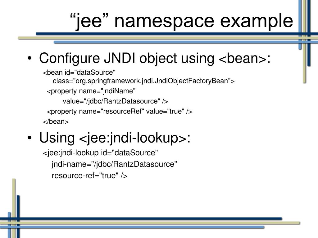 “jee” namespace example • Configure JNDI object using <bean>: <bean id="dataSource" class="org.springframework.jndi.JndiObjectFactoryBean"> <property name="jndiName" value="/jdbc/RantzDatasource" /> <property name="resourceRef" value="true" /> </bean> • Using <jee:jndi-lookup>: <jee:jndi-lookup id="dataSource" jndi-name="/jdbc/RantzDatasource" resource-ref="true" />