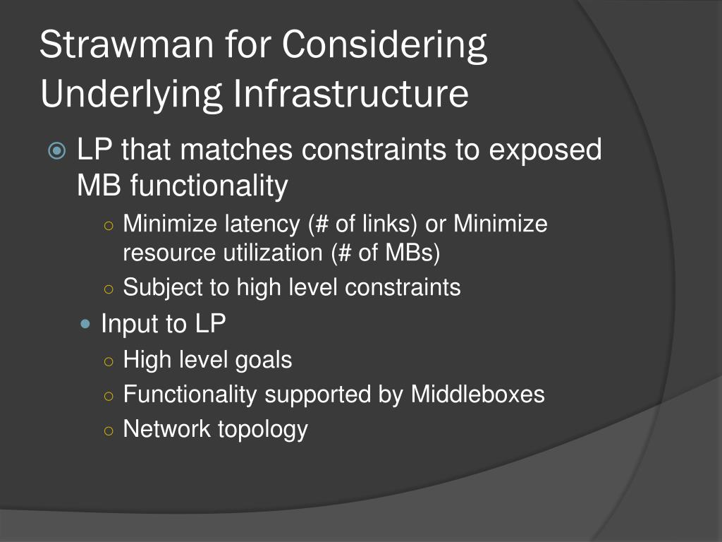 Strawman for Considering Underlying Infrastructure • LP that matches constraints to exposed MB functionality • Minimize latency (# of links) or Minimize resource utilization (# of MBs) • Subject to high level constraints • Input to LP • High level goals • Functionality supported by Middleboxes • Network topology