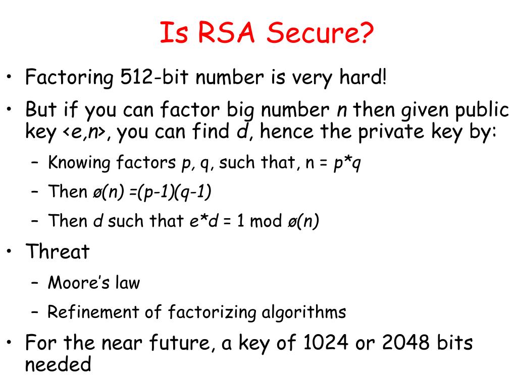Is RSA Secure? • Factoring 512-bit number is very hard! • But if you can factor big number n then given public key <e,n>, you can find d, hence the private key by: • Knowing factors p, q, such that, n= p*q • Then ø(n) =(p-1)(q-1) • Then d such that e*d = 1 mod ø(n) • Threat • Moore’s law • Refinement of factorizing algorithms • For the near future, a key of 1024 or 2048 bits needed