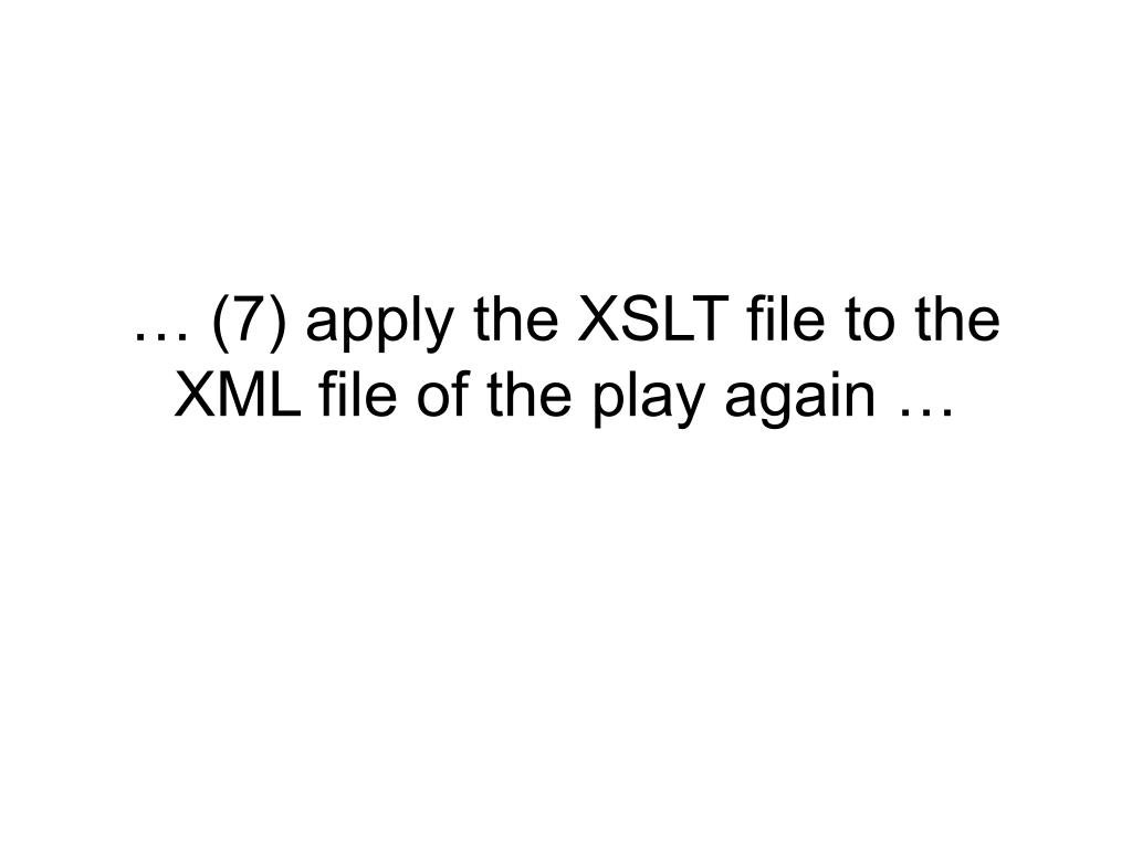 (5) … add some HTML <?xml version="1.0" encoding="UTF-8"?> <xsl:stylesheet version="1.0" xmlns:xsl="http://www.w3.org/1999/XSL/Transform"> <xsl:template match="/"> <xsl:apply-templates select="//TITLE"/> </xsl:template> <xsl:template match="TITLE"> <xsl:value-of select="."/> </xsl:template> </xsl:stylesheet>