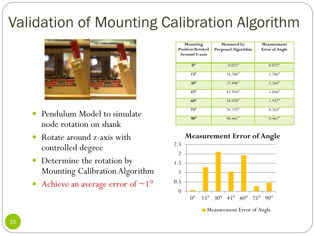 Validation of Mounting Calibration Algorithm • Pendulum Model to simulate node rotation on shank • Rotate around z-axis with controlled degree • Determine the rotation by Mounting Calibration Algorithm • Achieve an average error of ~1°