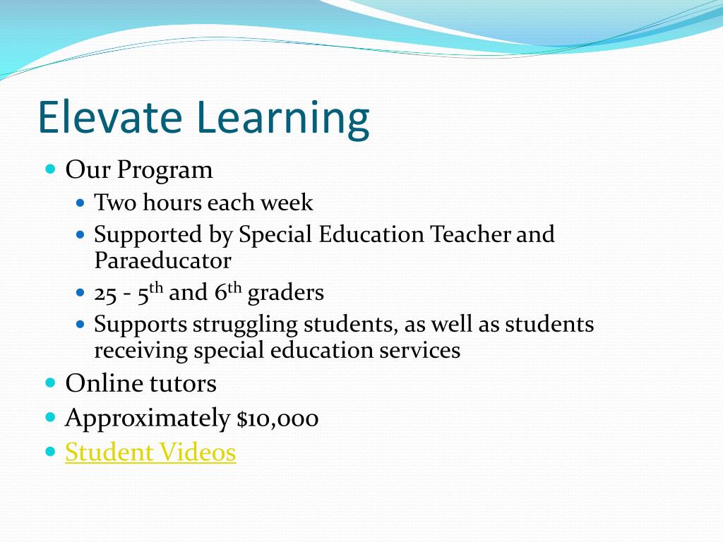 Elevate Learning • Our Program • Two hours each week • Supported by Special Education Teacher and Paraeducator • 25 - 5th and 6th graders • Supports struggling students, as well as students receiving special education services • Online tutors • Approximately $10,000 • Student Videos