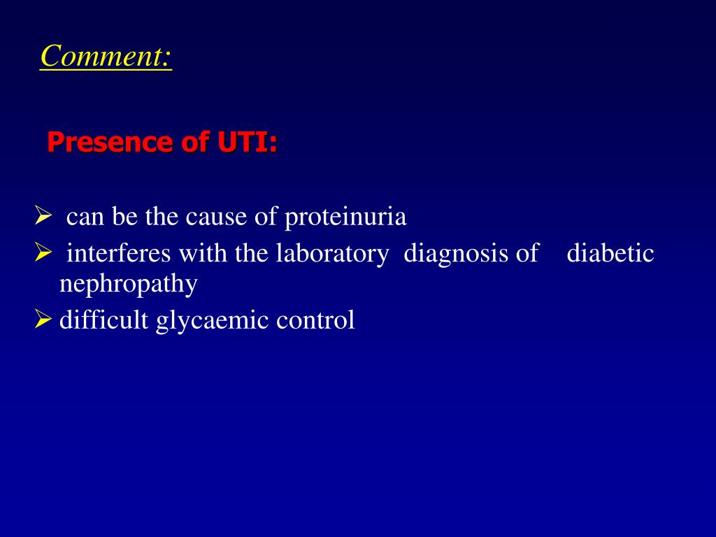 Comment: Presence of UTI: • can be the cause of proteinuria • interferes with the laboratory diagnosis of diabetic nephropathy • difficult glycaemic control