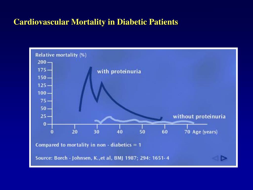 Albuminuria • Microalbuminuria ( 30 – 300 mg/day) - increased CV risks - progression to macroalbumuria • Macroalbuminuria ( > 300 mg /day) - risk of ESRD