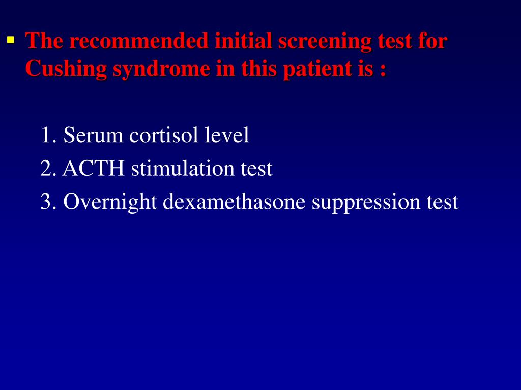 The recommended initial screening test for Cushing syndrome in this patient is : 1. Serum cortisol level 2. ACTH stimulation test 3. Overnight dexamethasone suppression test