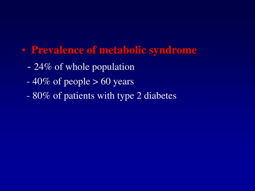 Prevalence of metabolic syndrome - 24% of whole population - 40% of people > 60 years - 80% of patients with type 2 diabetes