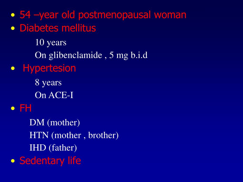 54 –year old postmenopausal woman • Diabetes mellitus 10 years On glibenclamide , 5 mg b.i.d • Hypertesion 8 years On ACE-I • FH DM (mother) HTN (mother , brother) IHD (father) • Sedentary life
