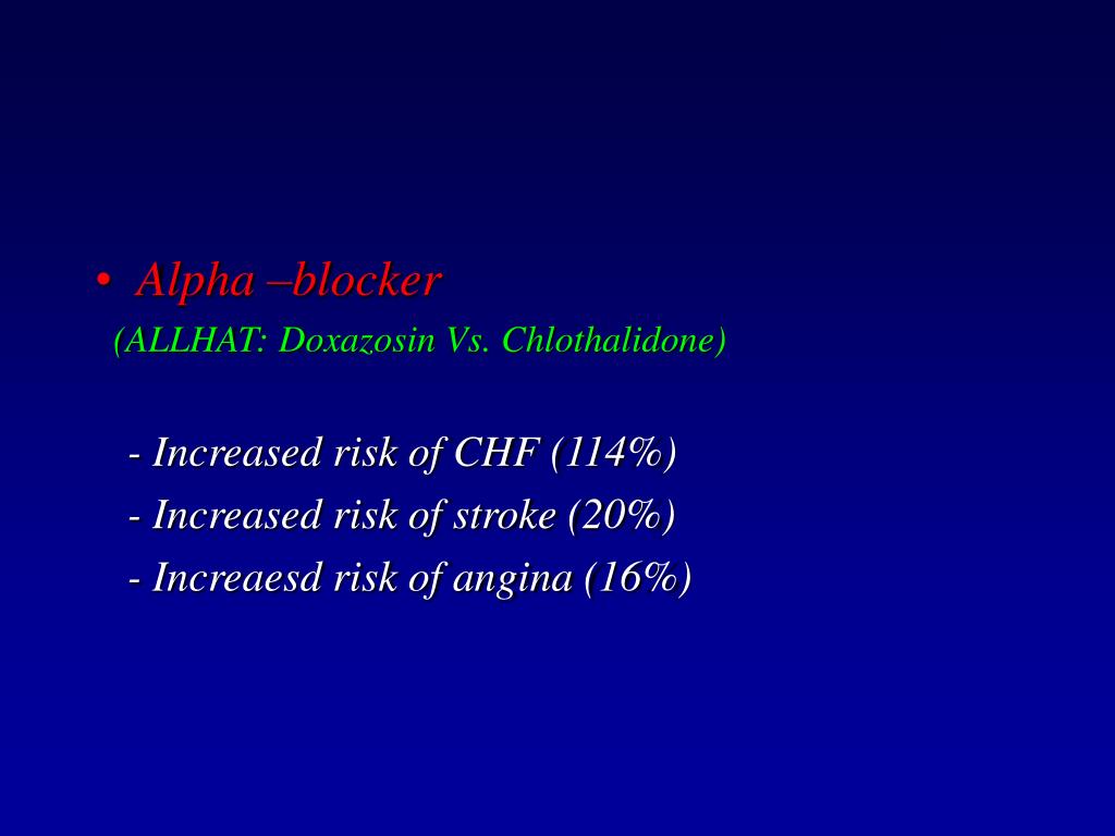 Alpha –blocker (ALLHAT: Doxazosin Vs. Chlothalidone) -Increased risk of CHF (114%) - Increased risk of stroke (20%) - Increaesd risk of angina (16%)