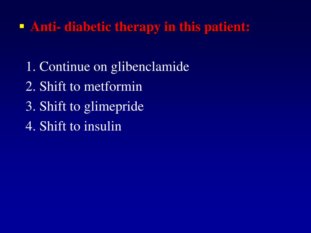Anti- diabetic therapy in this patient: 1. Continue on glibenclamide 2. Shift to metformin 3. Shift to glimepride 4. Shift to insulin