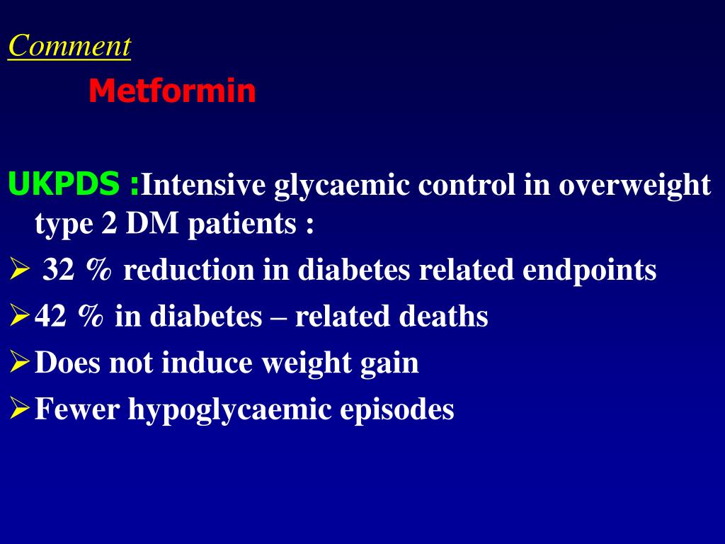 Comment Metformin UKPDS :Intensive glycaemic control in overweight type 2 DM patients : • 32 % reduction in diabetes related endpoints • 42 % in diabetes – related deaths • Does not induce weight gain • Fewer hypoglycaemic episodes
