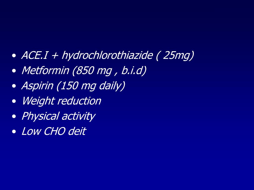 ACE.I + hydrochlorothiazide ( 25mg) • Metformin (850 mg , b.i.d) • Aspirin (150 mg daily) • Weight reduction • Physical activity • Low CHO deit