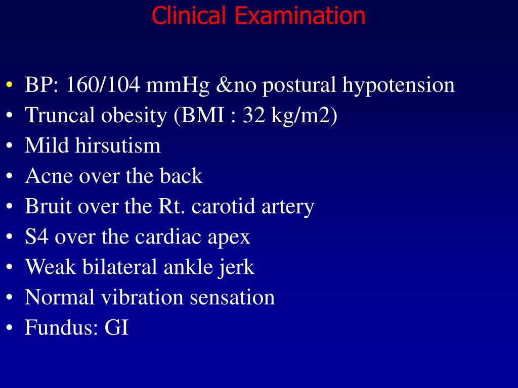 Clinical Examination • BP: 160/104 mmHg &no postural hypotension • Truncal obesity (BMI : 32 kg/m2) • Mild hirsutism • Acne over the back • Bruit over the Rt. carotid artery • S4 over the cardiac apex • Weak bilateral ankle jerk • Normal vibration sensation • Fundus: GI
