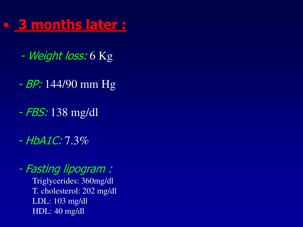 3 months later : - Weight loss:6 Kg - BP:144/90 mm Hg - FBS:138 mg/dl - HbA1C:7.3% - Fasting lipogram : Triglycerides: 360mg/dl T. cholesterol: 202 mg/dl LDL: 103 mg/dl HDL: 40 mg/dl