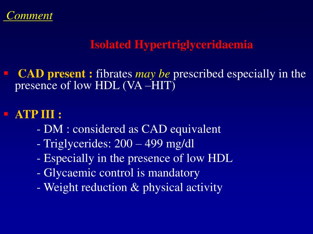 Comment Isolated Hypertriglyceridaemia • CAD present : fibrates may be prescribed especially in the presence of low HDL (VA –HIT) • ATP III : - DM : considered as CAD equivalent - Triglycerides: 200 – 499 mg/dl - Especially in the presence of low HDL - Glycaemic control is mandatory - Weight reduction & physical activity