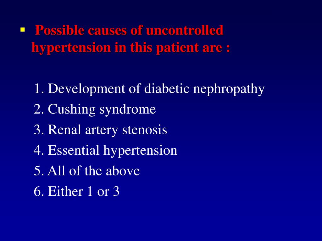 Possible causes of uncontrolled hypertension in this patient are : 1. Development of diabetic nephropathy 2. Cushing syndrome 3. Renal artery stenosis 4. Essential hypertension 5. All of the above 6. Either 1 or 3
