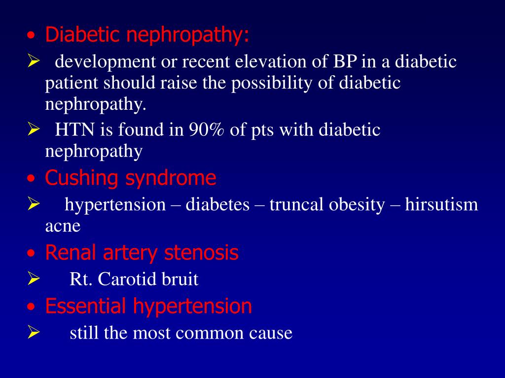 Diabetic nephropathy: • development or recent elevation of BP in a diabetic patient should raise the possibility of diabetic nephropathy. • HTN is found in 90% of pts with diabetic nephropathy • Cushing syndrome • hypertension – diabetes – truncal obesity – hirsutism acne • Renal artery stenosis • Rt. Carotid bruit • Essential hypertension • still the most common cause