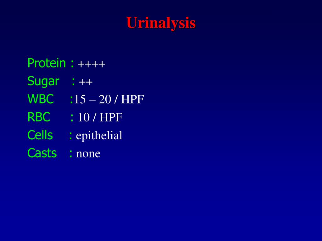 Urinalysis Protein :++++ Sugar :++ WBC :15 – 20 / HPF RBC :10 / HPF Cells :epithelial Casts :none