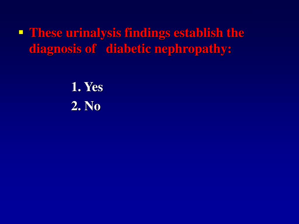 These urinalysis findings establish the diagnosis of diabetic nephropathy: 1. Yes 2. No